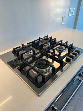 -Designer kitchen with high-end appliances: gas cooktop, wall oven, built-in microwave, full-size fridge/freezer & dishwasher