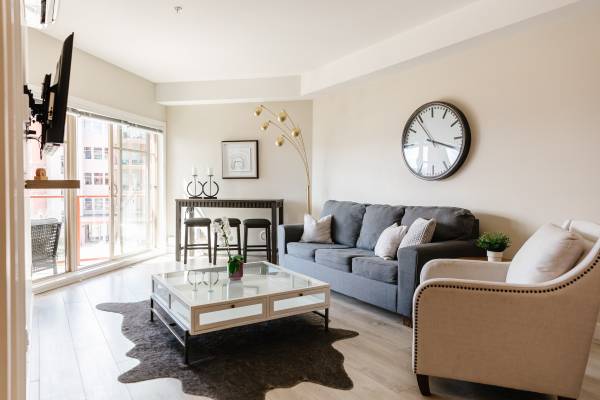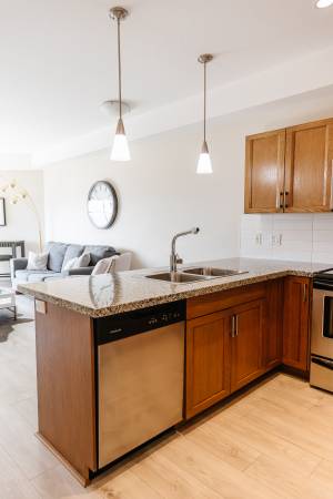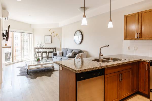 With north and south facing views of the beautiful Okanagan lake and the surrounding mountain landscape you will feel right at home from the moment you walk in. The living area is comfortably furnished with a modern style sofa and chair situated around a flat screen TV. The kitchen is finished with granite counter tops, stainless steel appliances and a dining room table seating 4.
