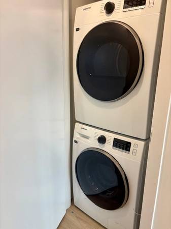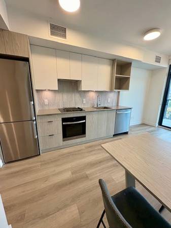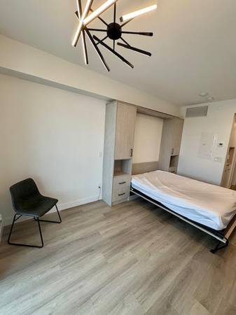 The unit is unfurnished but comes with a built in Queen wall bed that converts to a kitchen table to optimize space.