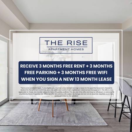 Promotion: Join us for an OPEN HOUSE on Saturday, November 15th from 12:00pm-3:00pm! Receive 3 Months FREE RENT + 3 Months FREE PARKING + 3 Months FREE WIFI When You Sign a New 13 Month Lease*Terms and conditions apply. To be eligible, you must be a new resident and sign a lease for the specified lease term. Residents receive the first and last month free, plus one additional month of rent credited pro-rated across the lease term. The offer is not applicable for those who transfer within the Devon Properties portfolio. This is a one-time offer and may be withdrawn or extended at any time by Devon Properties Ltd. Offers, benefits and services are subject to change and are not an essential, required, or ancillary service provided by the Landlord.