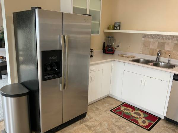 Stainless steel appliances include double fridge with ice and filtered water dispensers, dishwasher, induction stove.