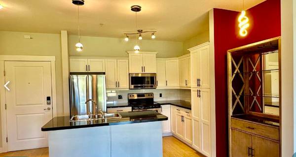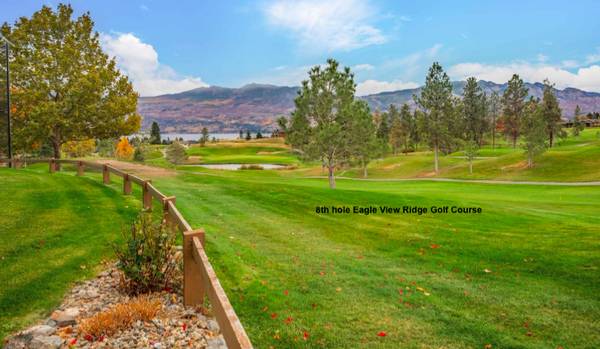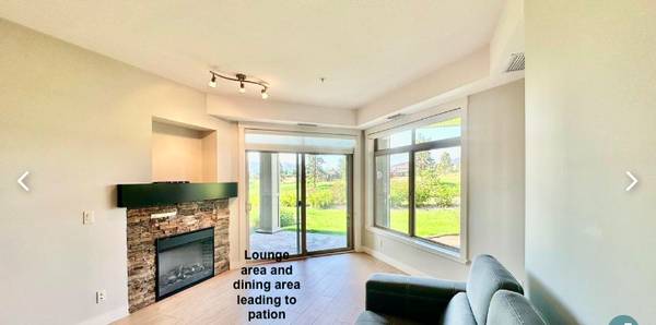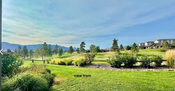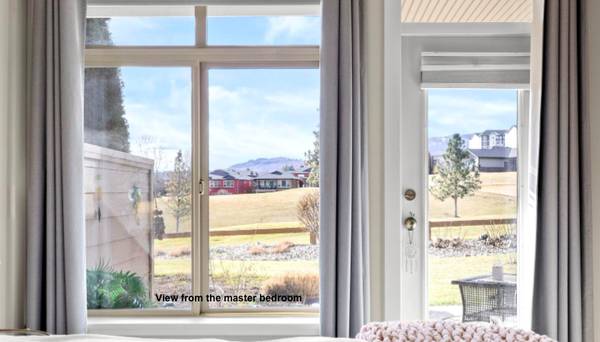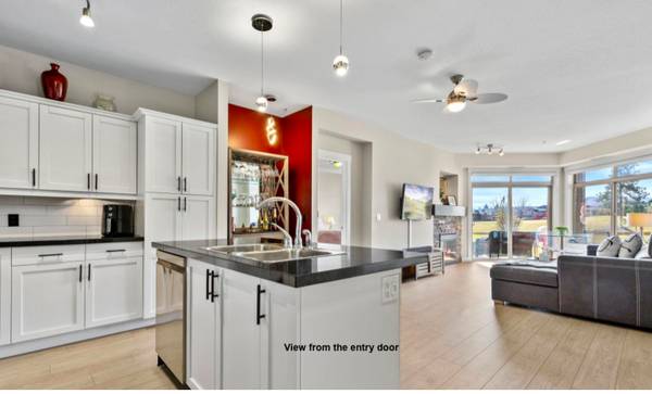 Open floor plan with oversized window, lots of natural light! The kitchen (bright white cabinets, stainless-steel appliances, granite countertops and central island with eating bar). The living room ( cozy gas fireplace, views of the golf course, lake and mountains and access to outside patio).