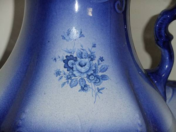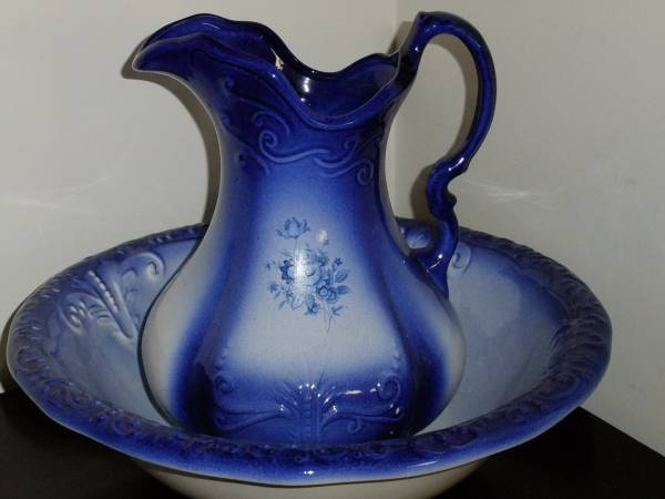 Vintage Large Ironstone Flow Blue Victorian Pitcher and Basin Set. Basin 15.5" Diameter, Pitcher 11" Tall. $50 Call or text