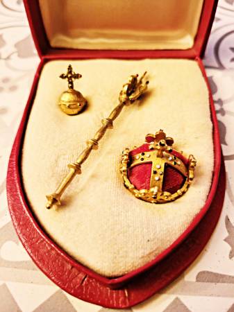 Case containing three miniature elements, symbols of the Regalia of the Holy Roman Empire: the scepter, the crown and the crucifer orb, in silver vermeil with small enamel decorations, from Prague (Czech Republic), vintage early 20th century.