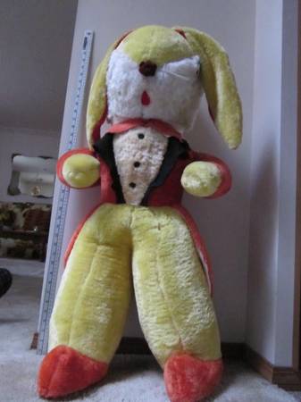 RARE 1960's 3 FOOT TALL STUFFED TOY RABBIT FOR SALE. OVER 60 YEARS OLD. MANUFACTURED BY GANZ BROS TOY COMPANY IN ONTARIO ( see tag photo ). Features ; Plush Floppy Ears , Red Long Tail Tux , And Generous Size . A Perfect Addition For Child's Bedroom , Nursery , Or Playroom . A True Vintage Collectible And Enjoyable Toy.
