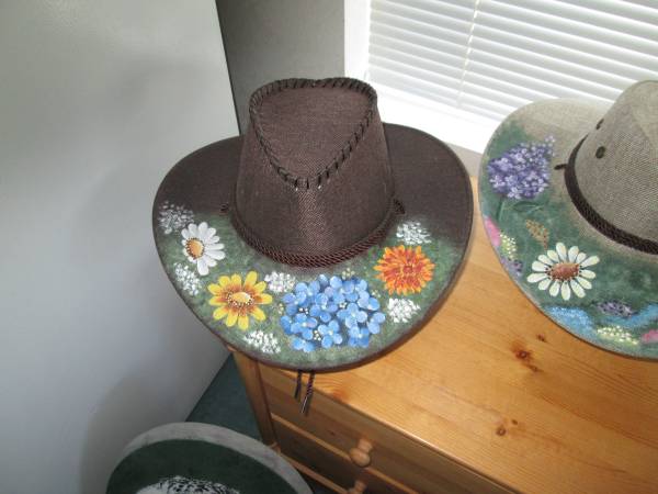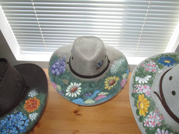 EXCELLENT GIFT IDEA! THREE FANTASTIC HAND PAINTED LADIES HATS PAINTED BY "LARAIN". THESE HATS ARE WONDERFUL FOR WEARING TO AN EVENT OR JUST GOING FOR A WALK, CAMPING OR DARE I SAY FISHING. THE HATS ARE $25. EACH. PLEASE CALL show contact info