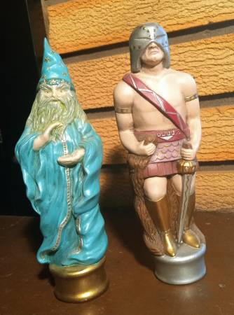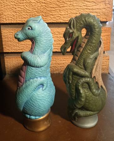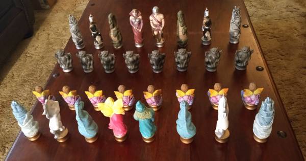 One-of-a-kind hand-painted ceramic chess set. Each piece has a unique design and coloring, depicting a fantasy world of mythological characters. “White” ceramic chess pieces are represented in the form of characters from the fairy world and the "Black" pieces in the form of mysterious creatures like dragons and goblins.