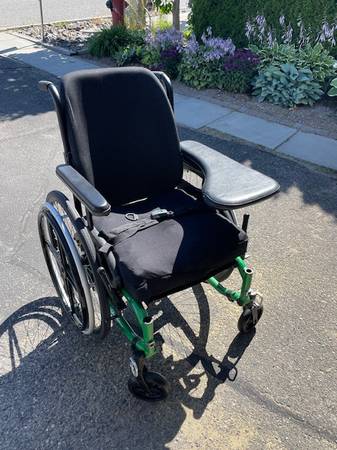 Custom adjustable wheelchair. Has adjustable seat 12”-20” off the floor, lightweight aluminum alloy frame, one hand drive can move both wheels ( great if someone has had a stroke). This feature can also be disconnected if not required to a standard wheelchair. Reinforced back. Can fit a child to an adult up to 265LBS / 120KG. Left armrest slides off he original armrest underneath. Standard left foot post can be purchased for $75.00 new and is avaliable. Wheelchair was manufactured in September 2024. Full details of original options in the photo. I have the information on all the specifications that it can be modified to as well avaliable. My father used it for 6 months before he passed. Paid $8000.