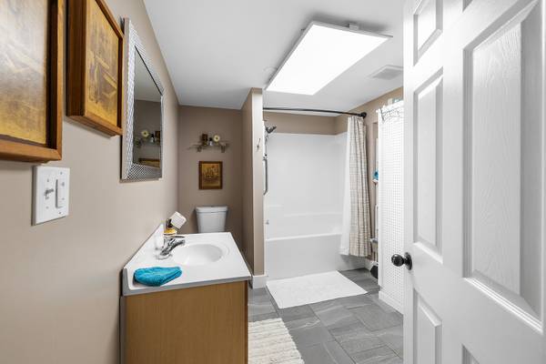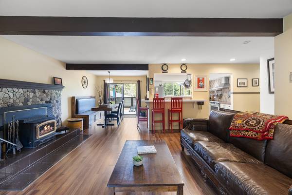 2-bed upper level with open layout, cozy fireplace & covered lakeview deck