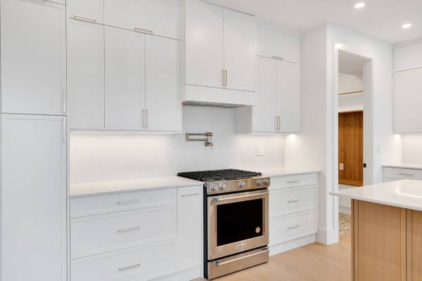 The gourmet kitchen features rich wood and white shaker cabinetry, stone countertops, a large centre island, and a convenient pot filler above the stove. Also on this level, the primary bedroom offers a walk-in closet and a luxurious ensuite. A covered patio, accessible from both the living room and primary bedroom, provides the perfect space for outdoor dining while taking in the lake views.