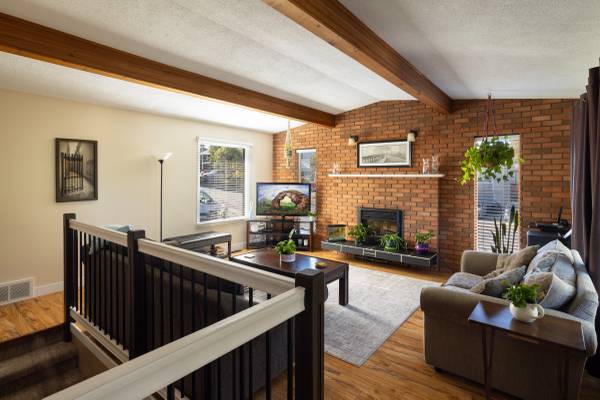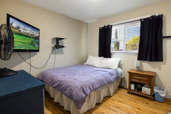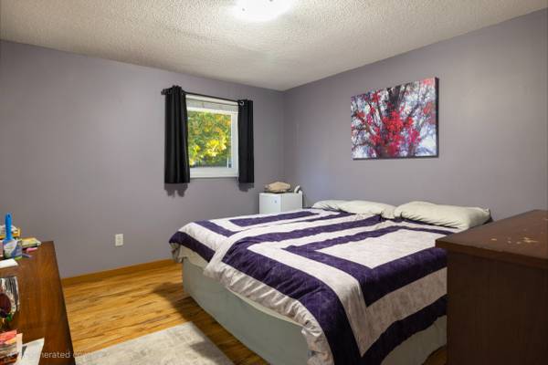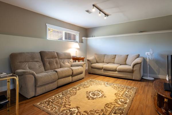 This bright and well-maintained home offers flexibility for families or investors. The upper suite includes three bedrooms on the main floor and a fourth bedroom on the lower level, providing space for guests, teens, or a home office. The living room features a full brick wall with a cozy fireplace that creates a warm and inviting gathering space. The kitchen offers plenty of cabinetry, stainless steel appliances (including a double door fridge), a tile backsplash, and a nearby two-piece powder room for guests. The dining area opens onto the balcony, perfect for outdoor meals or morning coffee with a view. A separate entrance from the kitchen provides direct backyard access for everyday convenience.