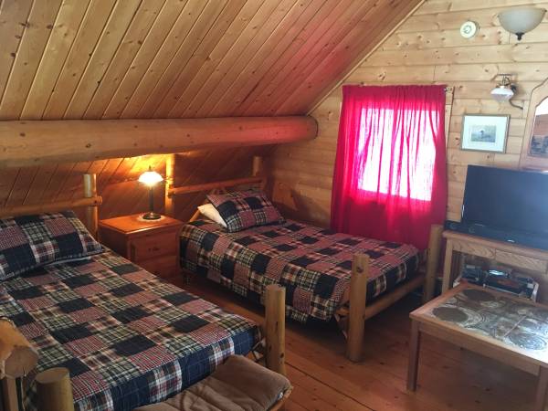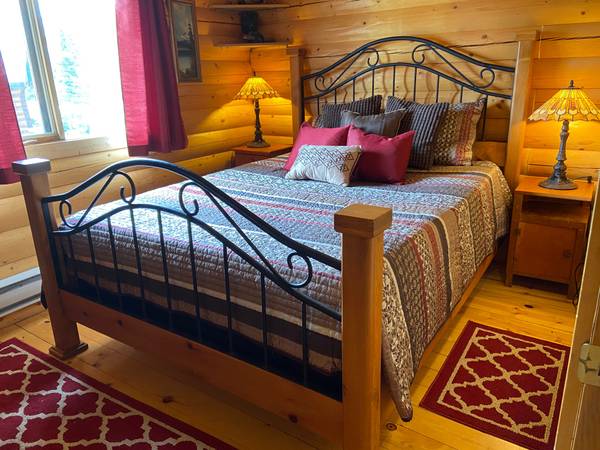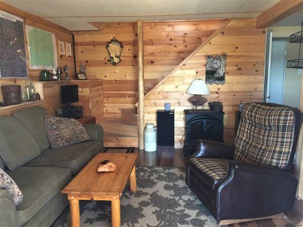 The spacious log cabin spans approximately 1,500 square feet across three floors. It includes two bedrooms and a loft, comfortably accommodating up to eight adults. Amenities abound, from a fully equipped kitchen with microwave and coffee maker to a claw-foot tub and shower. Electric baseboards in the bedrooms and bathroom keep you cozy and there’s even a stereo system, a wide selection of DVDs and VCRs, and internet access. The large deck overlooking the beautiful mountain lake features a barbecue for outdoor cooking.