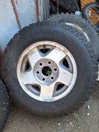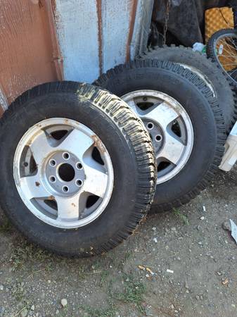 225/75-16" Traction King studded tires on aluminum wheels with 6x5.5" bolt pattern. $200 for the pair Text